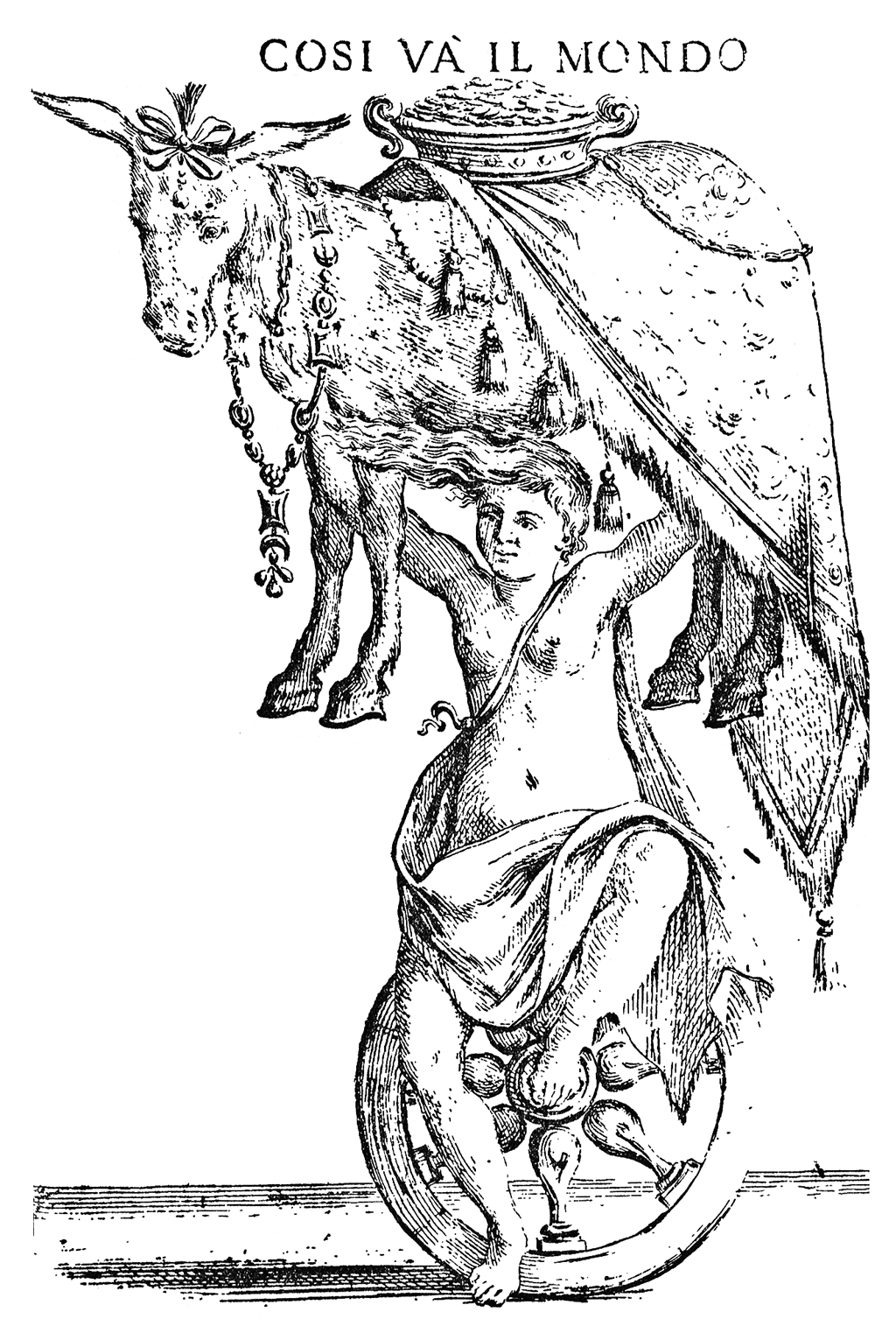 Chi vuol de l'opra sua far pago ogn'uno se stesso offende e non contenta alcuno - L'asino vuò montar perch'io già sento di tutti, oh che merlotti, oh che pazzia - Ch'in vece di montar sù quel giumento voglion col piede faticar per via - Cosi và il mondo